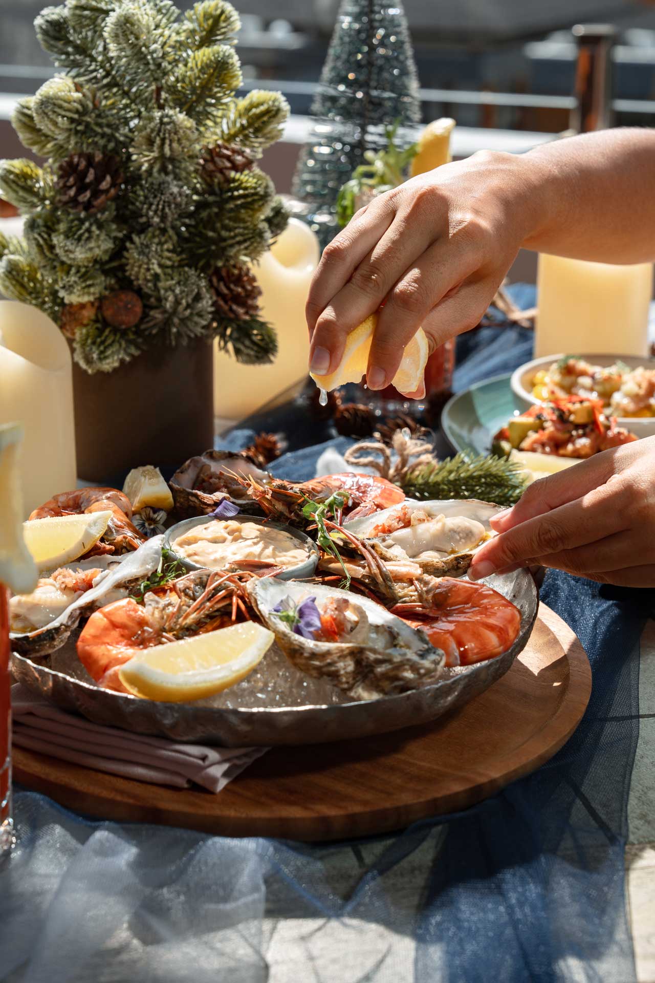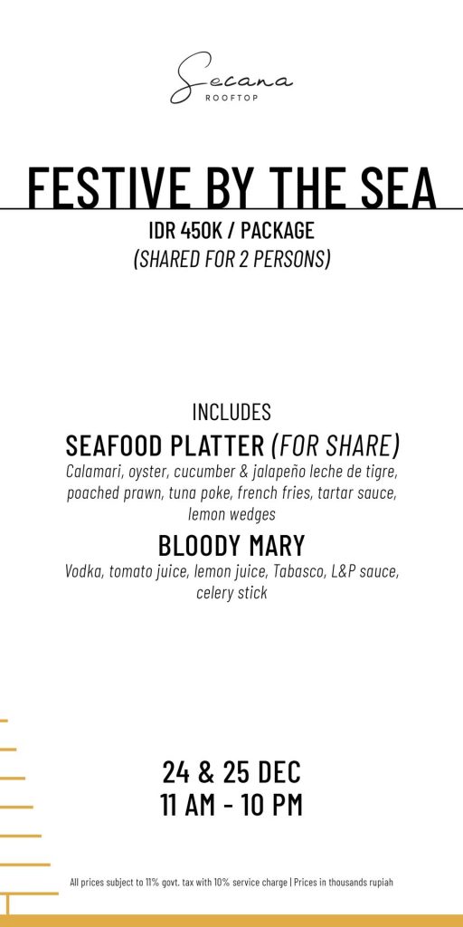 Celebrate the season Festive by the Sea at Secana Rooftop — available 24 & 25 December from 11 AM to 10 PM. Enjoy a seafood platter paired with our signature Bloody Mary, designed for two and perfect for long, easy holiday moments above the waves. Share the flavors, share the moment.
